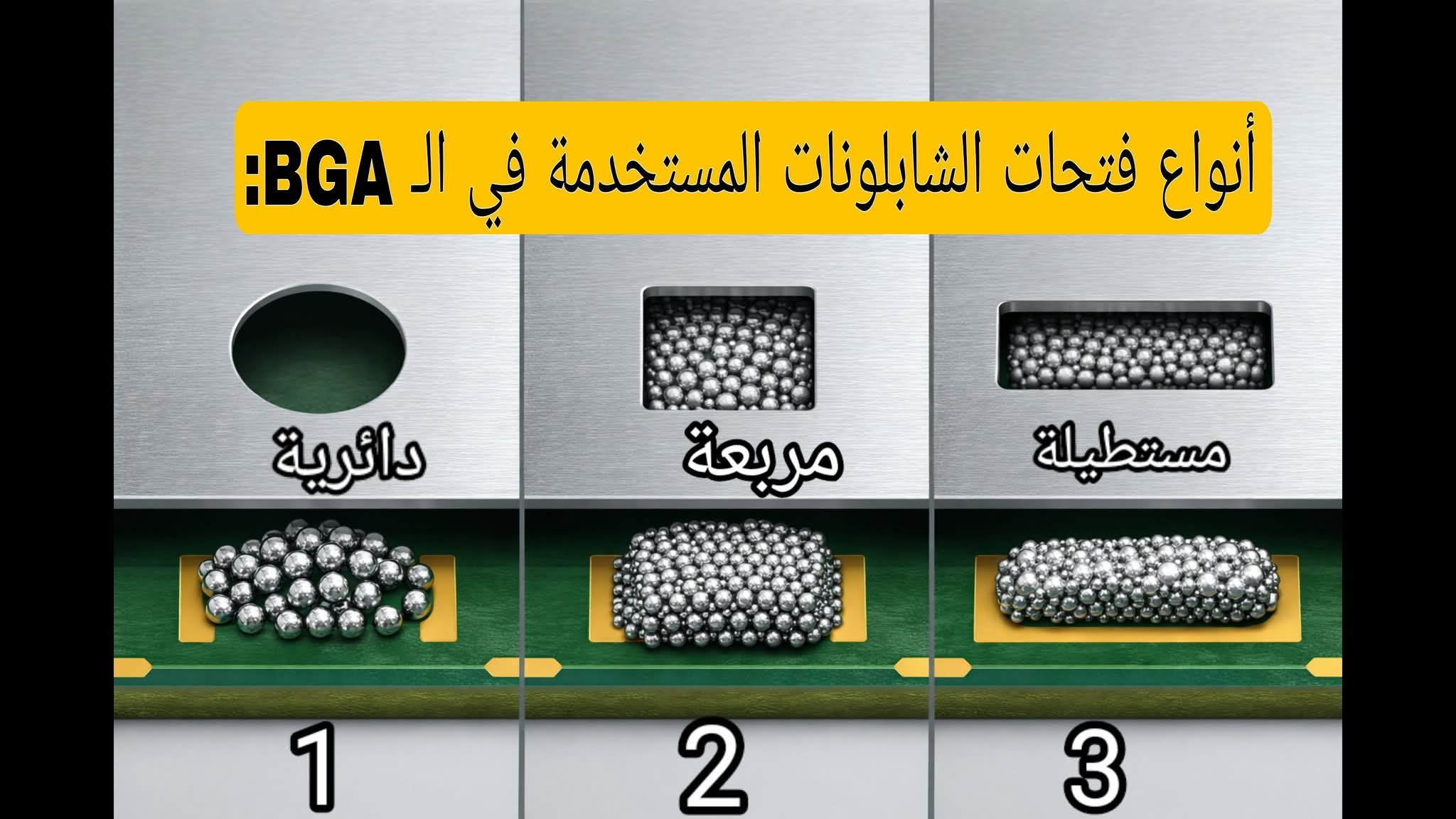 في عالم شابلونات BGA يوجد أكثر من شكل لفتحات الشابلونة، لكن أشهرها ثلاثة أنواع رئيسية: