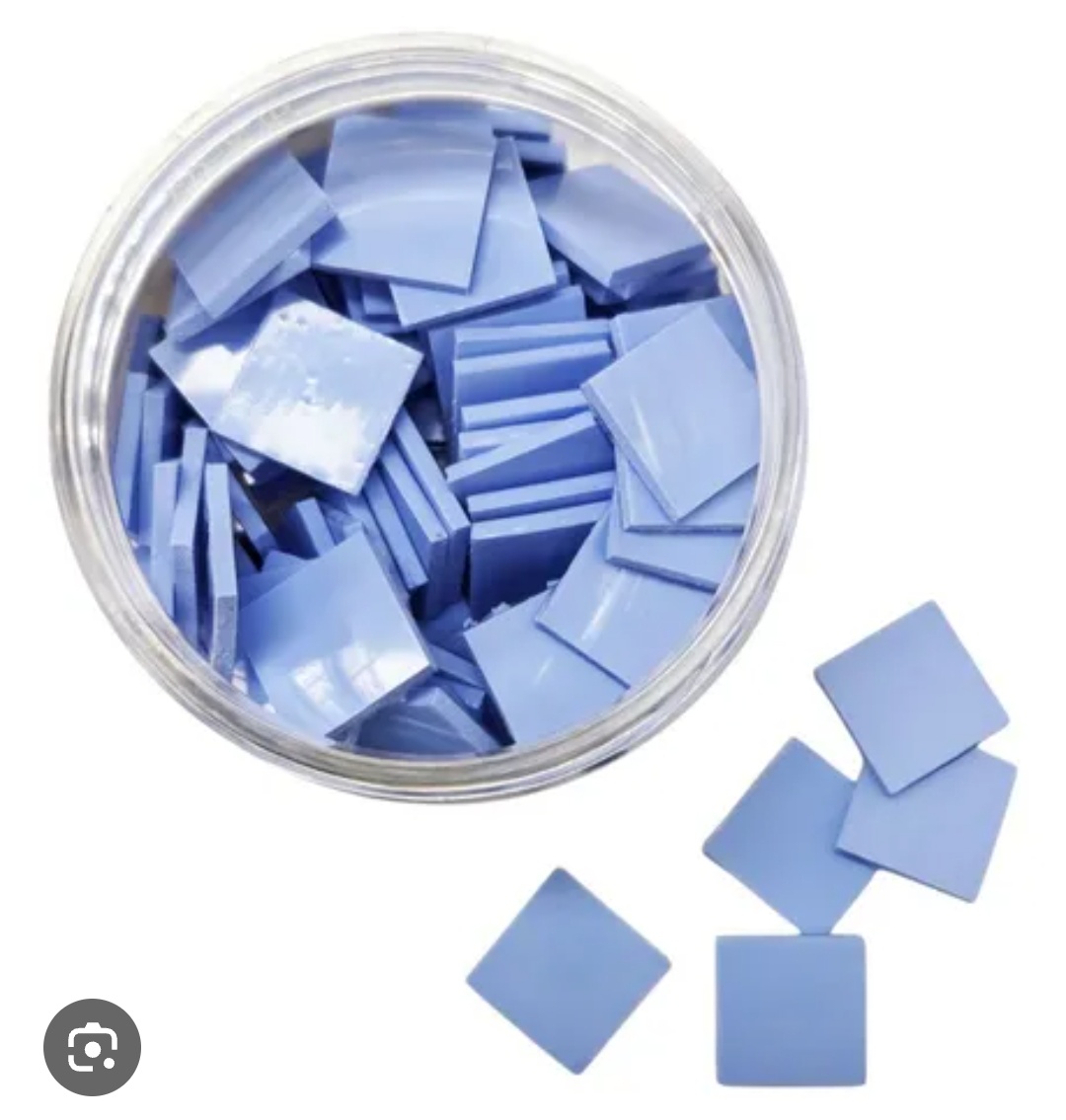تظهر الصورة حاوية بلاستيكية شفافة تحتوي على مجموعة من وسادات التبريد الحرارية (thermal pads) باللون الأزرق الفاتح.