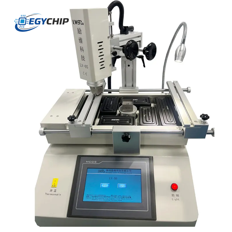 ماكينه فك وتركيب الشيب ست موديل LV-05 هي الحل الأمثل لفك وتركيب الرقائق الإلكترونية بدقة وكفاءة عالية، مناسبة للصيانة والإصلاح في الأجهزة الإلكترونية المتنوعة.