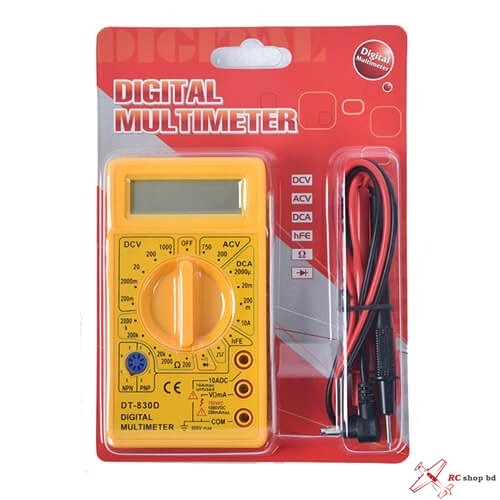 DT-830D Compact meter checks continuity of wires, fuses and electrical system components. Performs measurements of volts, amps, ohms and transistor gain (hFE). Can be used to test diodes. Low impedance meter can be used on automotive computer circuits. Rotary switch. Overload protection. Removable leads. 9 volt battery powered. 7 functions and 19 ranges Covers AC or DC voltage, resistance, DC amps, battery, diode and transistor Two 575mm test leads Diode and fuse protected Super sensitive meter